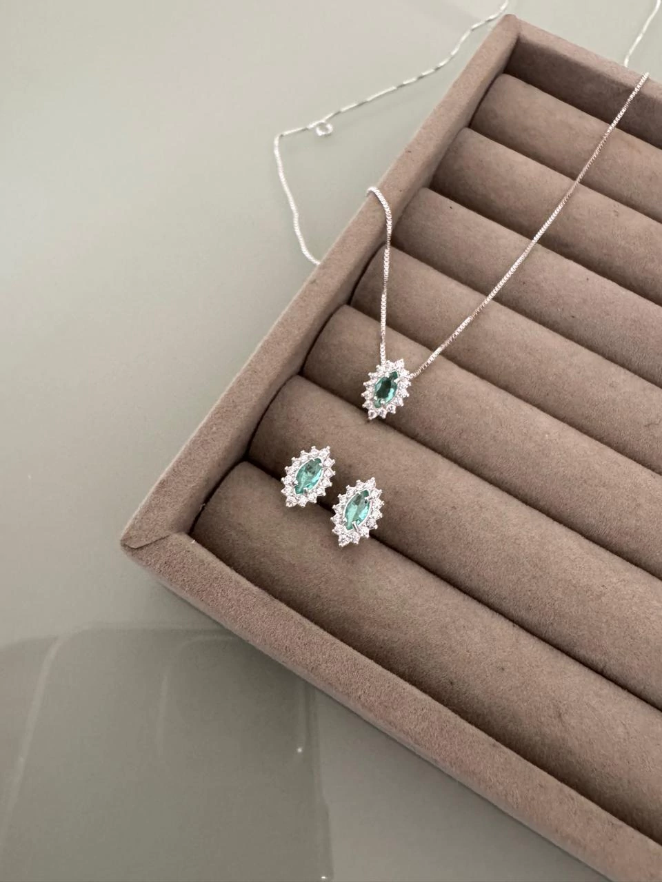 Descubra a elegância deste conjunto exclusivo, que combina brincos em formato navete com zircônias delicadamente cravejadas e uma correntinha fina em prata 925. Com brilho intenso e acabamento impecável, ele é perfeito para quem busca charme e sofisticação em qualquer ocasião.